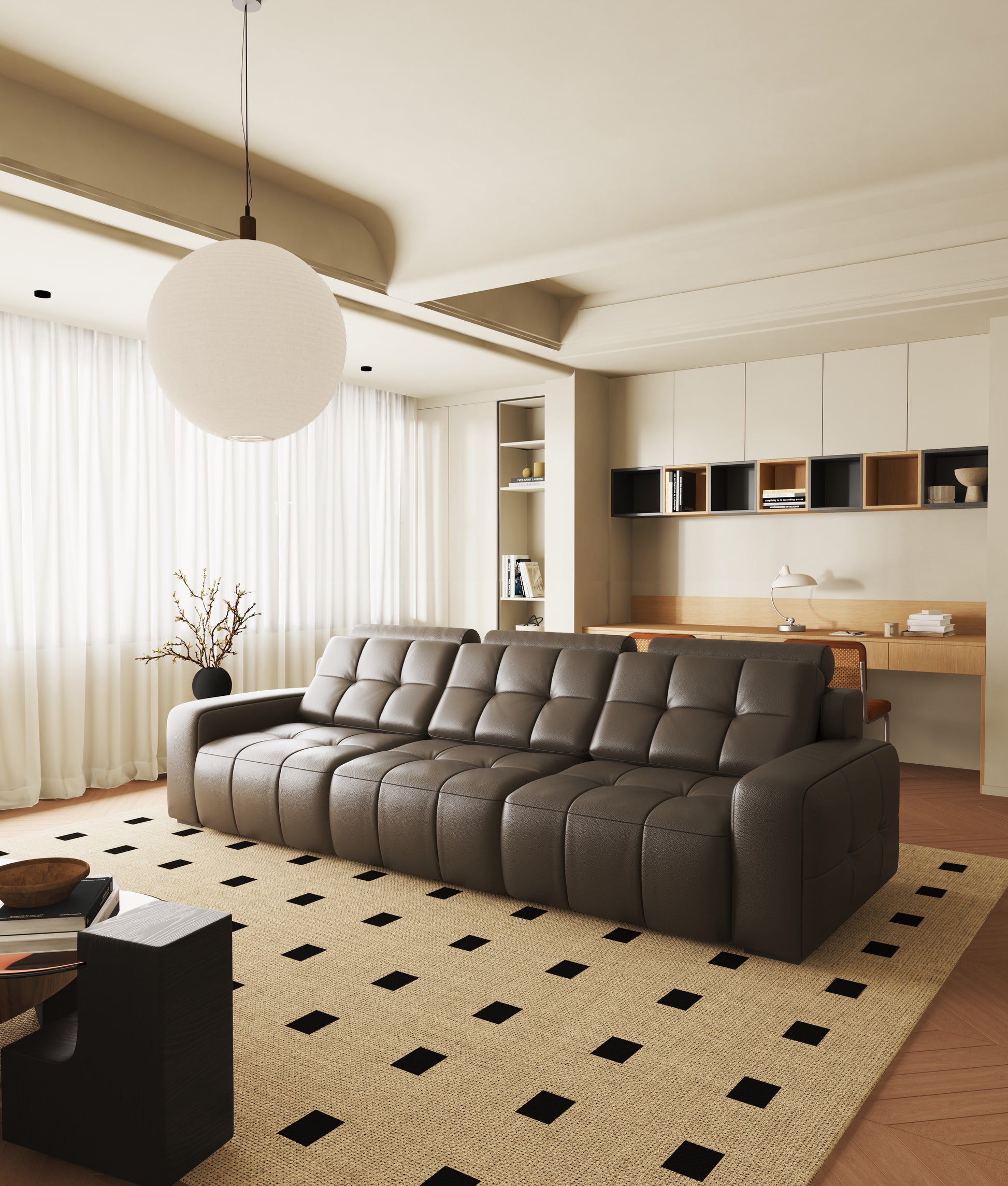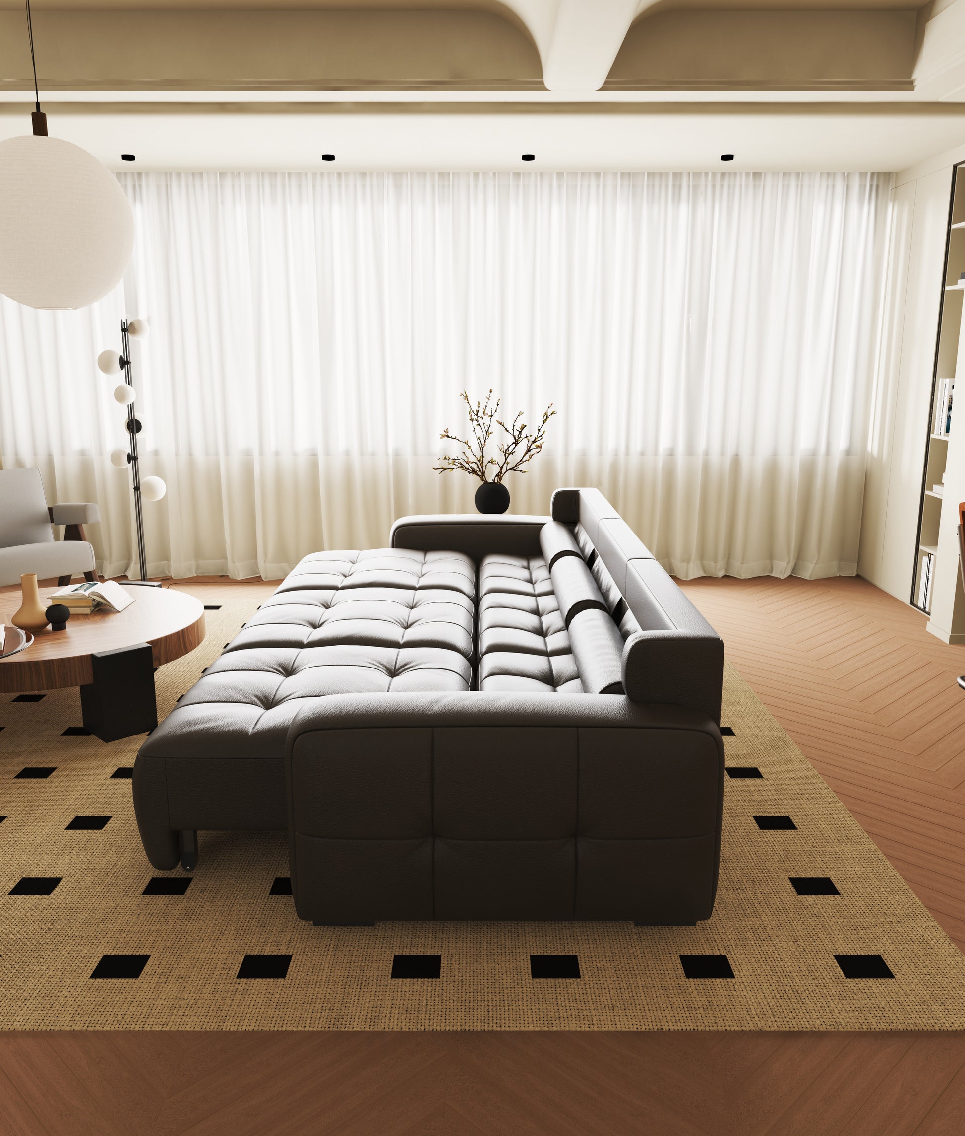 When fully extended, the Mars sofa reaches a seat depth of approximately 148 cm, offering a surface that feels closer to a bed than a traditional recliner.